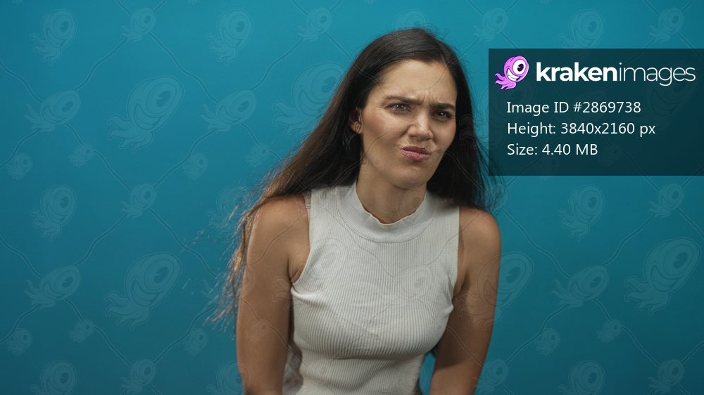 Woman covering eyes with hand in studio while grimacing against a teal backdrop, leaning forward and showing bare shoulder; disgust reaction.
