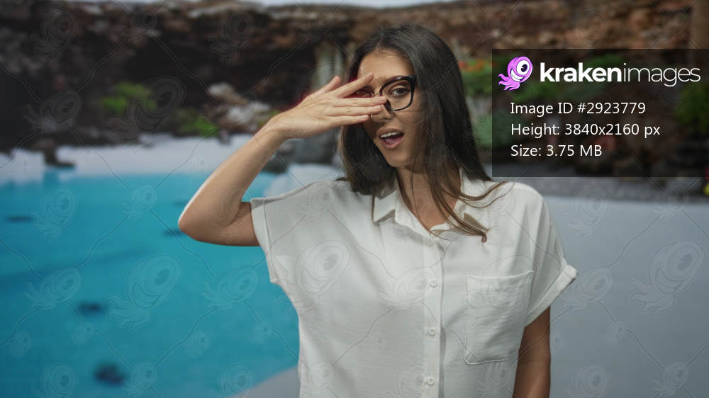 Woman covering eyes with hand and smiling at poolside outdoors while wearing white shirt and eyeglasses; playful relaxation.