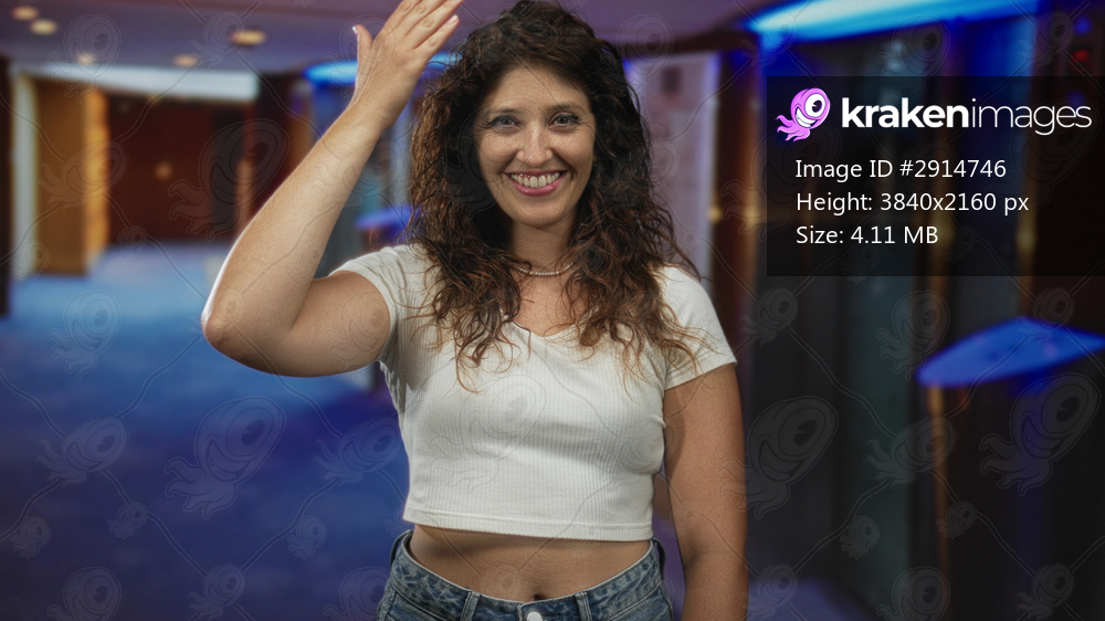 Woman covering eyes with hand and smiling in hotel corridor near elevator and trash bin; joy surprise playfulness.