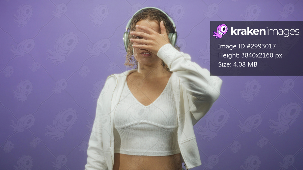 Woman covering eyes with hand, wearing headphones and white crop top in studio with purple backdrop; embarrassment.