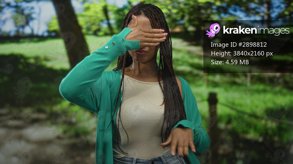 Woman covering eyes with hands in a forest park setting, wearing green cardigan over a light tank top and jeans, braided hair visible; shyness privacy. - Kraken Images