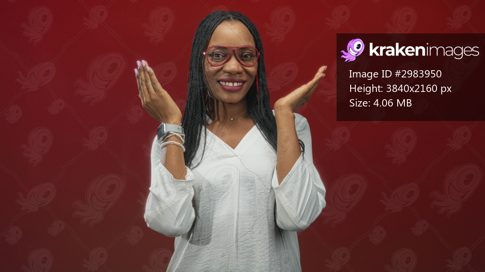 Woman covering eyes with hands in a red studio wearing white blouse and smartwatch; playful curiosity.