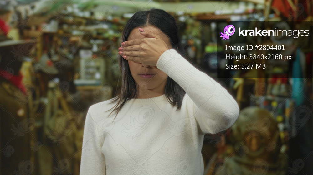 Woman covering eyes in cluttered store showing curiosity and mystery with diverse items in the background.