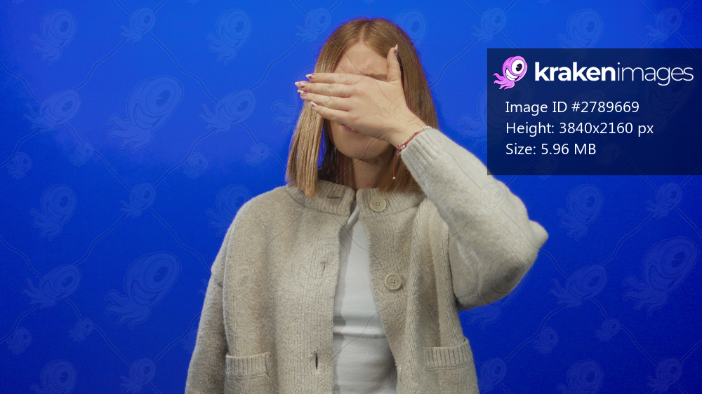 Woman covering face with hand against smooth blue background in a cozy sweater expressing mystery and privacy in isolated setting creating an intriguing atmosphere. - Kraken Images