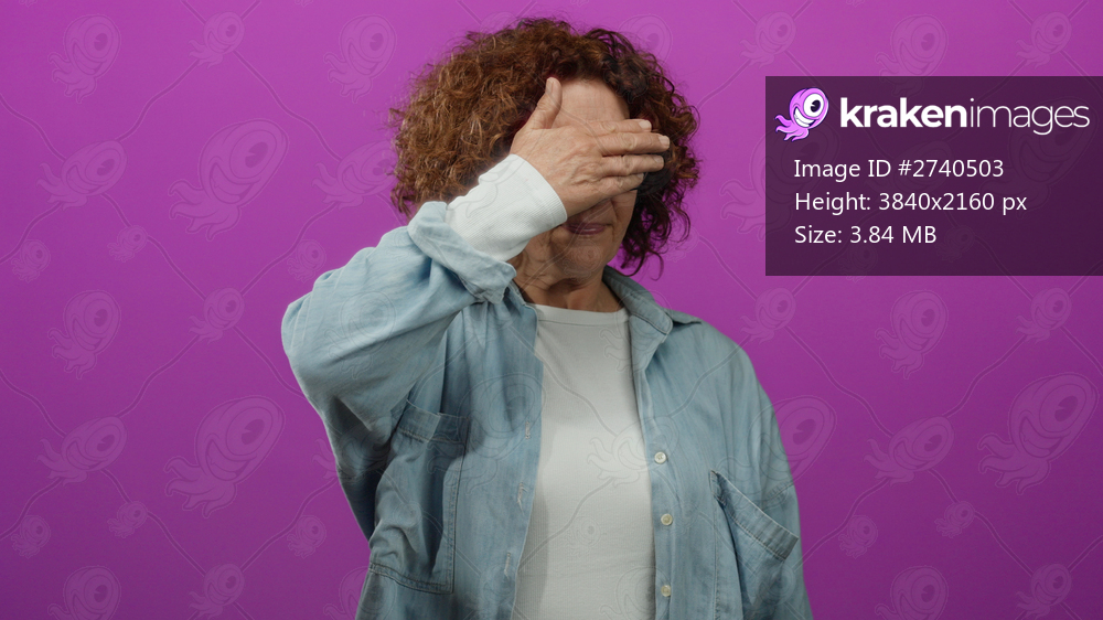 Woman covering face with hand against vibrant pink background wearing casual denim shirt expressing playful shyness in an isolated setting.