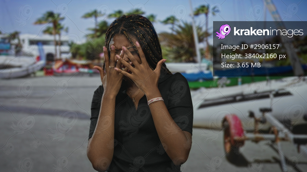 Woman covering face with hands and hands raised to block on a street near marina and boats; embarrassment avoidance.