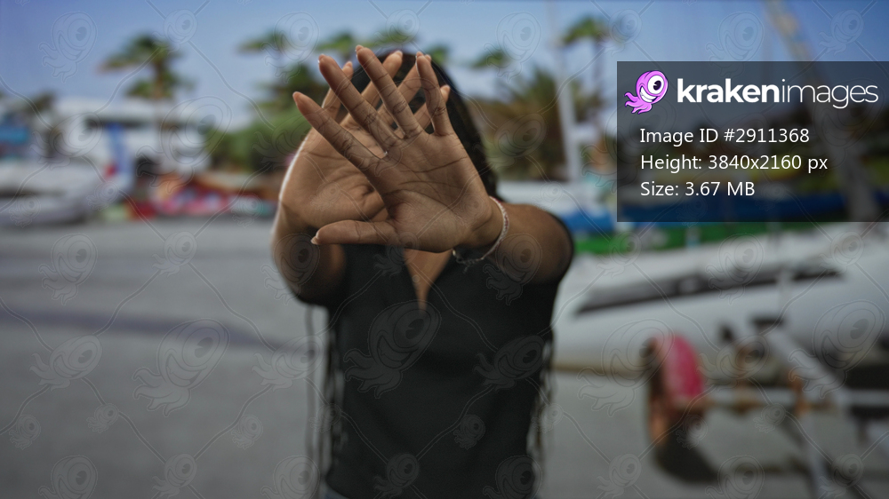 Woman covering face with hands and hands raised to block on a street near marina and boats; embarrassment avoidance.