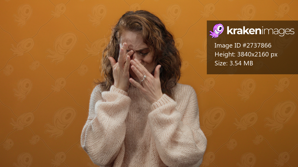 Woman covering face with hands in cozy sweater over vibrant orange background conveying emotion and introspection in an isolated setting.