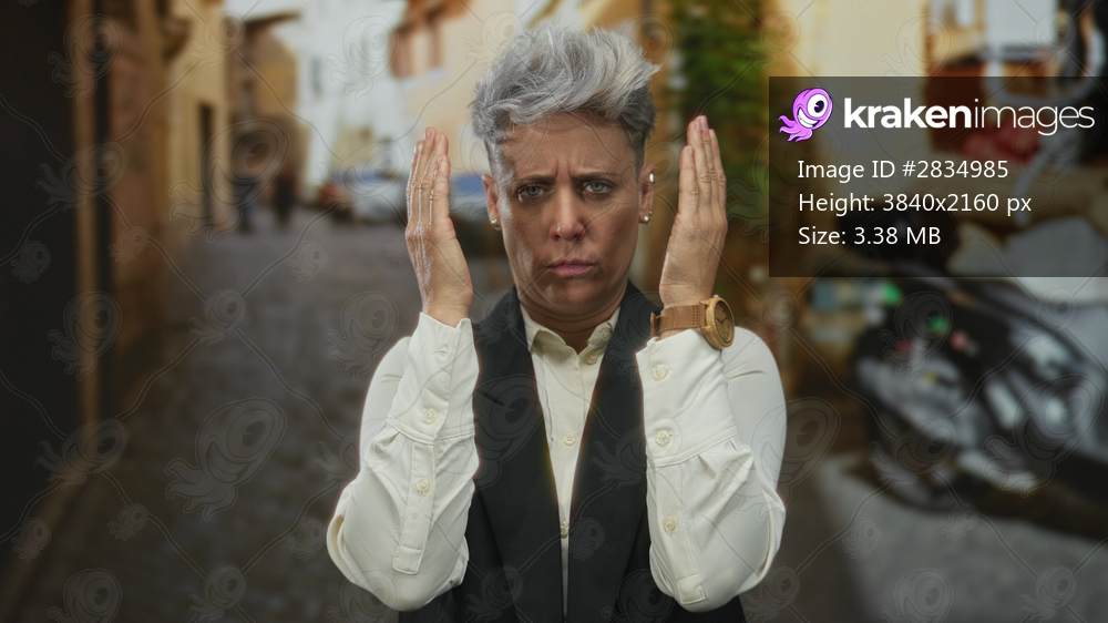 Woman covering face with hands on a busy street in broad daylight amid blurred scooters and cobblestones; embarrassment.