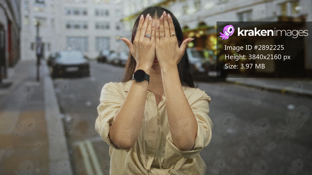 Woman covering face with hands and winking while sticking out tongue on street; playful candid confidence.