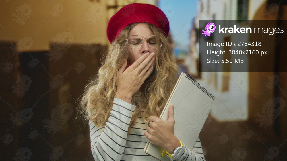 Woman covering hand while yawning on street in blonde young outfit holding notebook wearing glasses and hat outdoors.