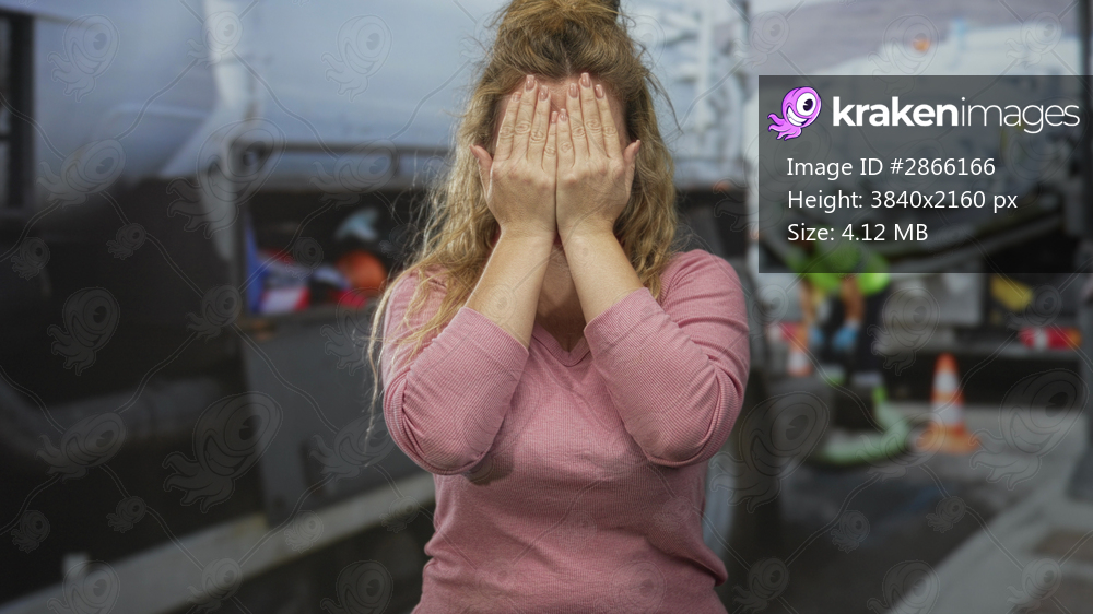 Woman covering her eyes with both hands on a street beside a tanker truck and traffic cones, palms visible and hair loose; surprise.