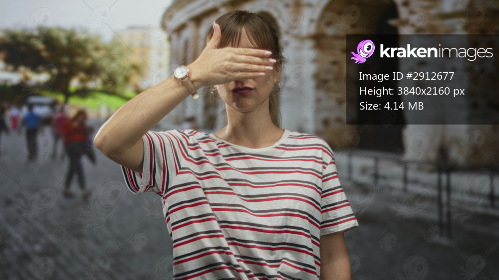 Woman covering her eyes with one hand in a building by the coliseum, smiling with glasses and a visible watch on wrist; playful joy.