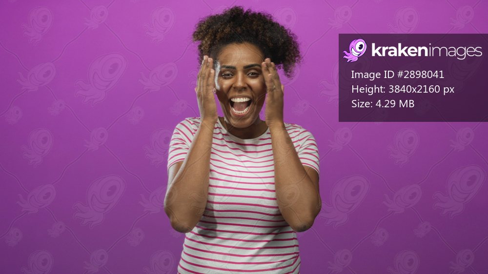 Woman covering her face with both hands in studio against purple backdrop wearing a striped tee and visible ring on finger; surprise play emotion.
