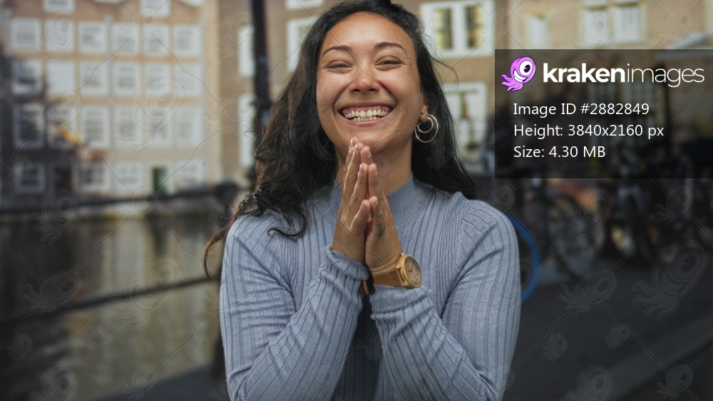 Woman covering her face with hand laughing on a street canal in amsterdam wearing blue sweater and hoop earrings; joy.