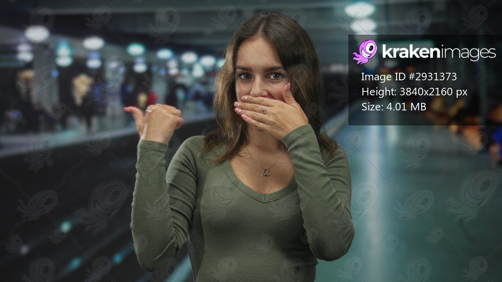 Woman covering her mouth with hand while thumb points toward a busy station platform indoors beside railway tracks; playful secrecy.