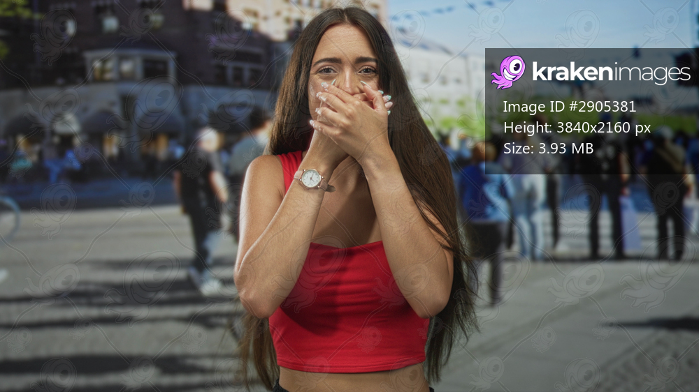 Woman covering mouth with both hands and closed eyes on a busy city street with blurred pedestrians; surprise silence.