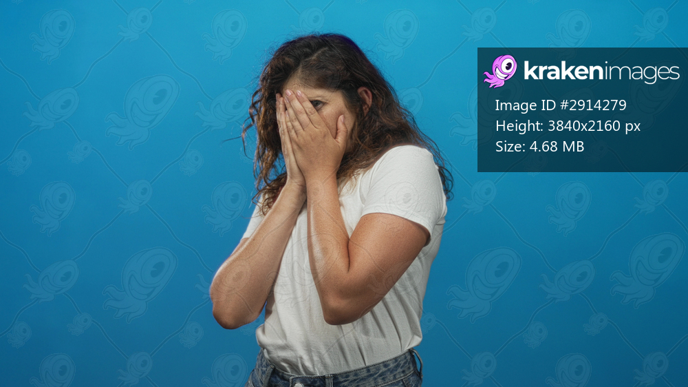 Woman covering mouth with both hands in blue studio wearing white tshirt and jeans; anxiety vulnerability.