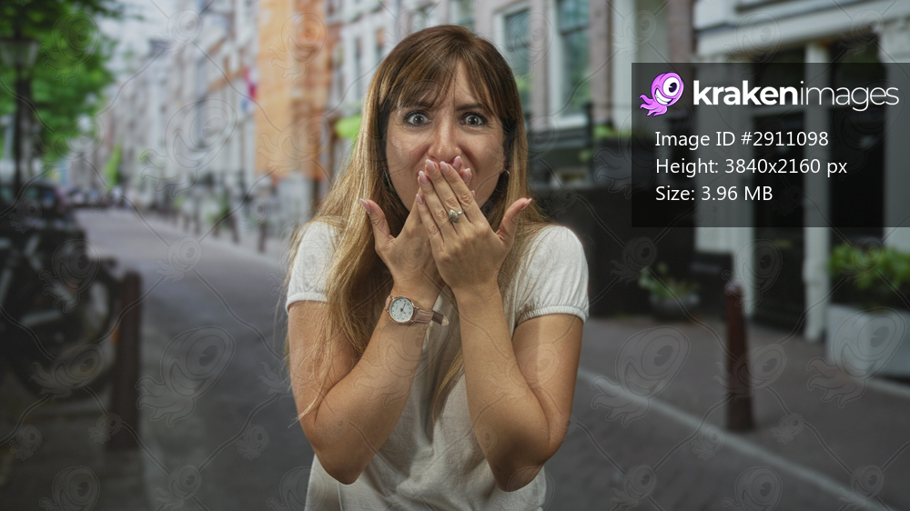 Woman covering mouth with both hands on a city street lined with bicycles and brick buildings, wide eyed expression; surprise reaction.
