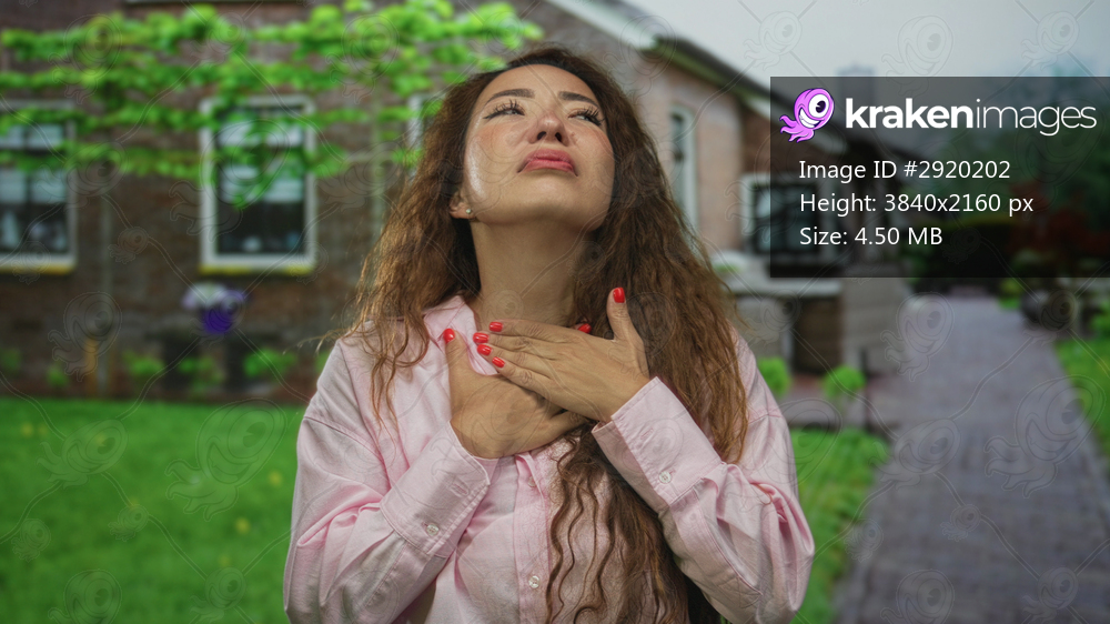 Woman covering mouth with both hands and rubbing eyes while standing at a building entrance in a yard; allergy symptoms discomfort.