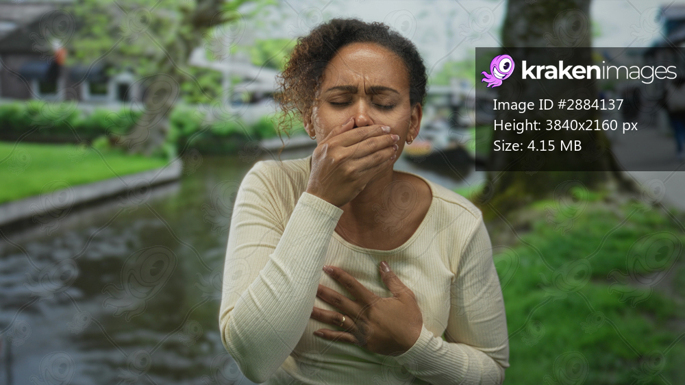 Woman covering mouth and clutching chest on street by a canal and tree path with blurred pedestrians and boat in view; nausea concern.