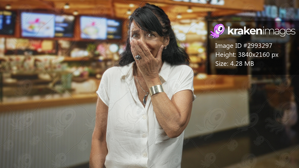 Woman covering mouth with hand at a cafe counter, face partly hidden and silver cuff visible; surprise vulnerability.