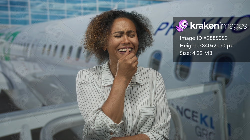 Woman covering mouth with hand at airport terminal gate by airplane mural, wearing striped shirt and leaning on railing, grimacing; travel anxiety.