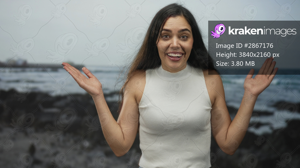 Woman covering mouth with hand at sandy rocky seaside coastline wearing sleeveless top; unexpected shock.