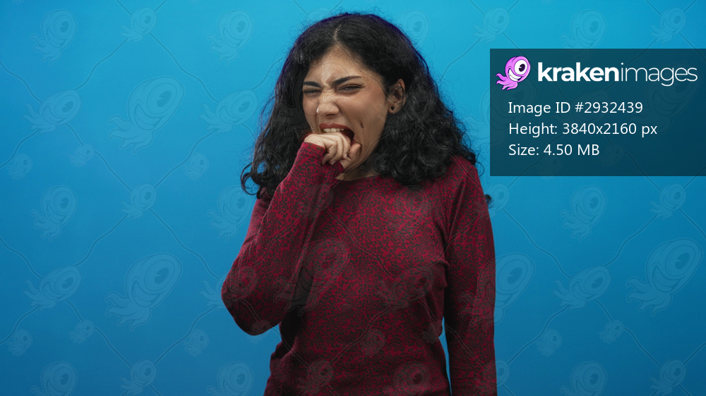 Woman covering mouth with hand and biting her fist in studio against vivid blue background while wearing maroon sweater and curly hair visible; tiredness. - Kraken Images