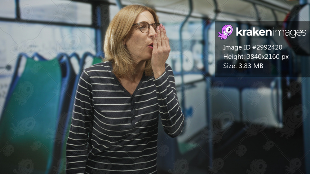 Woman covering mouth with hand by bus seat, wearing glasses and striped top on street; surprise curiosity playfulness.