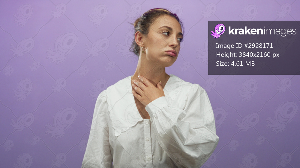 Woman covering mouth with hand and closed eyes in studio against purple wall wearing white blouse; tiredness.