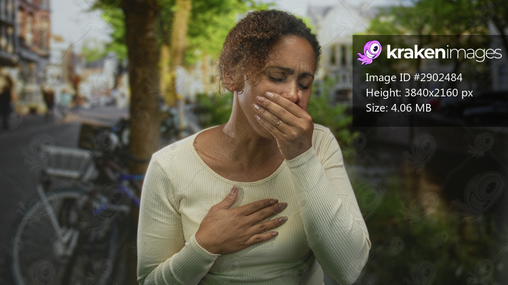 Woman covering mouth with hand and clutching chest on street by canal and parked bicycle, heartattack; distress anxiety worry.