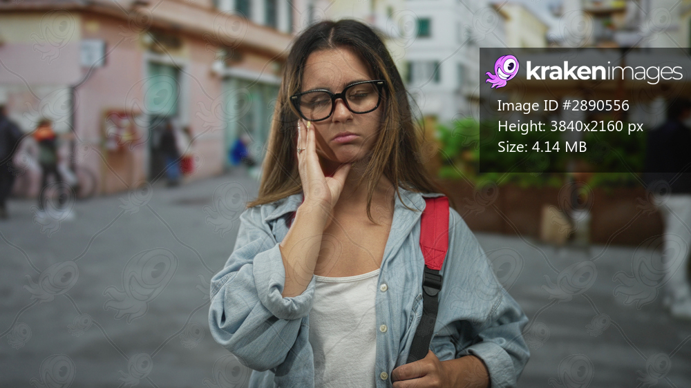 Woman covering mouth with hand and eyes closed while yawning on a city street with backpack visible; sleepiness.