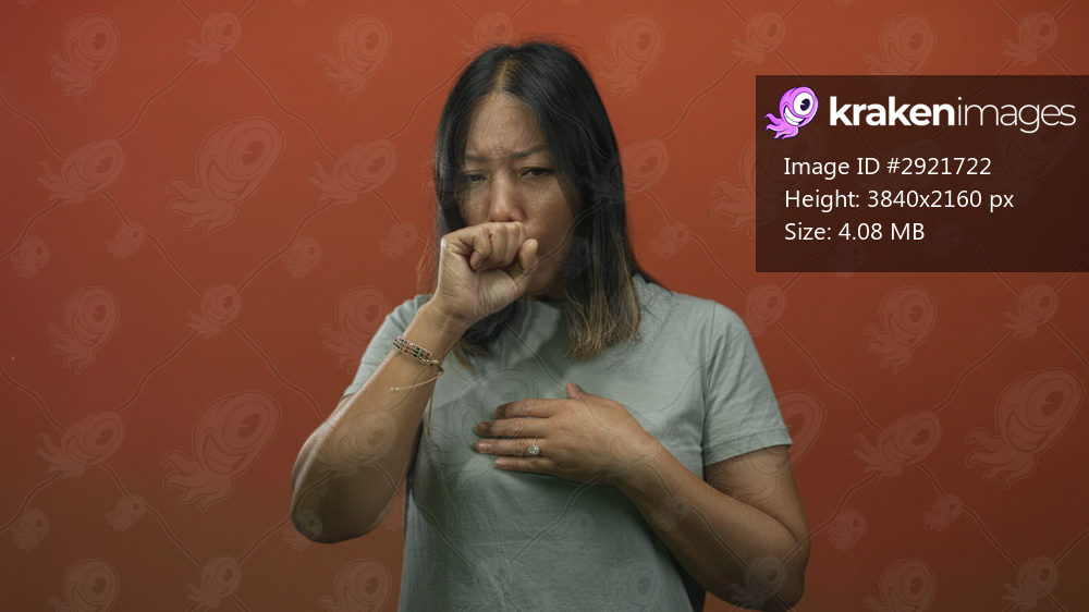 Woman covering mouth with hand and holding chest in orange studio with plain backdrop, wearing casual tshirt and bracelet, young latina; nausea.