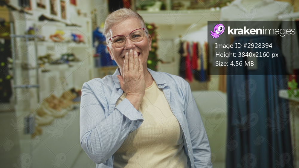 Woman covering mouth with hand in clothing store building among racks and shoes; surprise shopping moment.