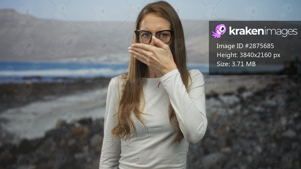 Woman covering mouth with hand in studio seaside set wearing glasses and white long sleeve facing camera, visible hand to mouth gesture; disgust odor.