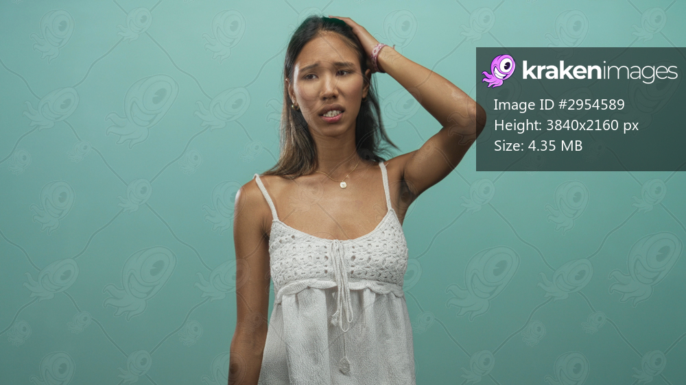 Woman covering mouth with hand in studio wearing white sleeveless dress and bracelet; anxiety worry confusion.