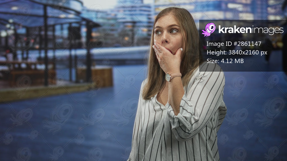 Woman covering mouth with hand in urban street setting while gazing ahead with open eyes; surprise shock astonishment awe.