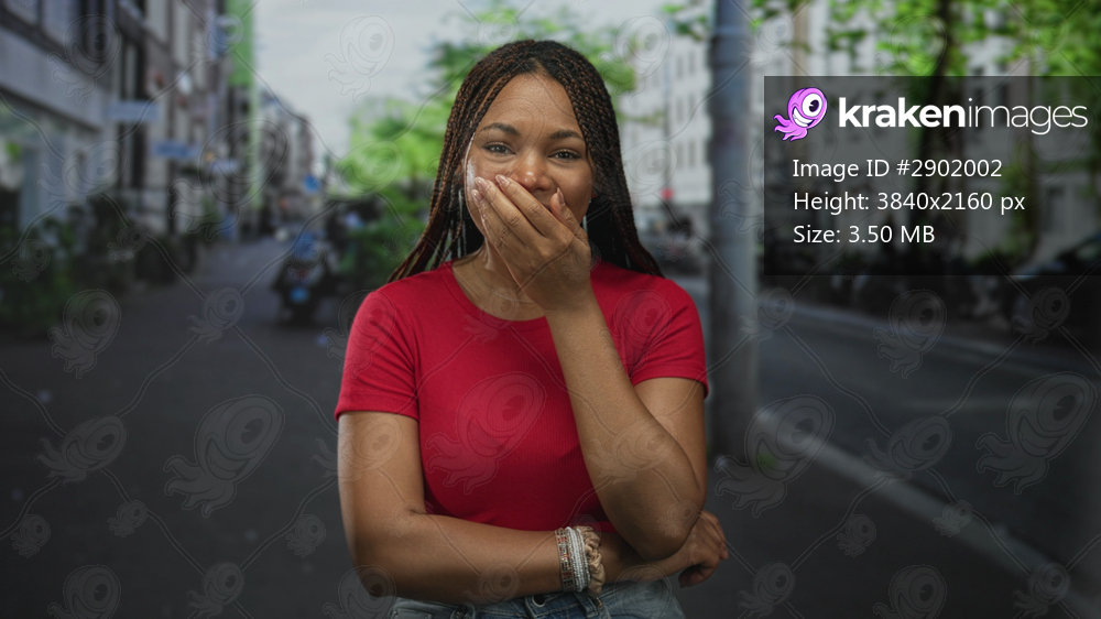 Woman covering mouth with hand on a city street wearing red shirt and bracelets, smiling with closed eyes and leaning slightly forward; surprise moment. - Kraken Images