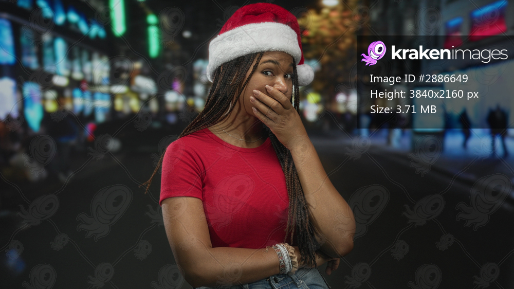 Woman covering mouth with hand on city street at night wearing santa hat and red top; holiday surprise.
