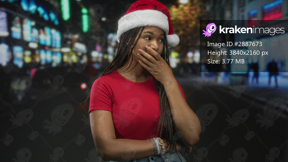 Woman covering mouth with hand on city street at night wearing santa hat and red top; holiday surprise.