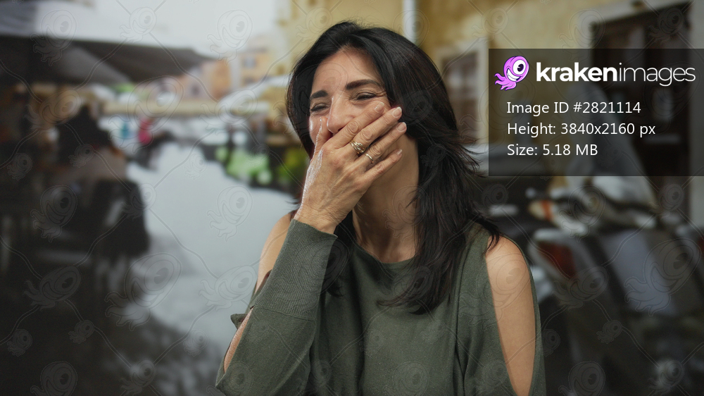 Woman covering mouth with hand on street restaurant terrace amid warm sunlight and parked scooter; joy.