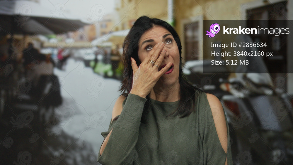 Woman covering mouth with hand on street restaurant terrace amid warm sunlight and parked scooter; joy.