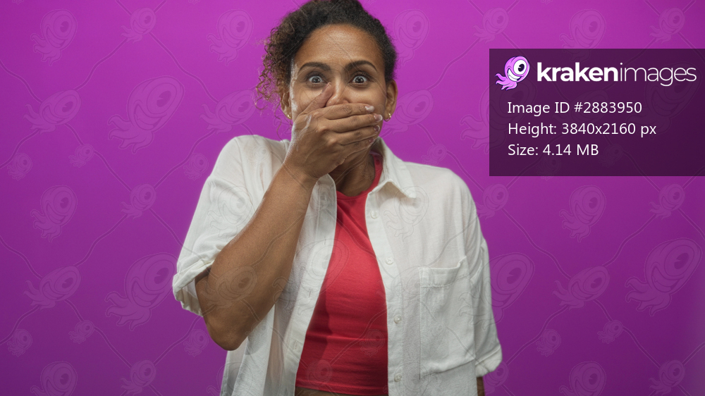 Woman covering mouth with hand while giving a thumbs up in studio with purple backdrop, wearing white shirt and red crop top; surprise.