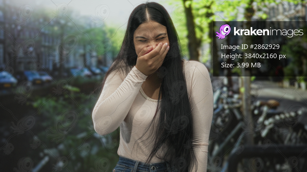 Woman covering mouth with hand while laughing on street by canal water and parked bicycle near building facade; joy.