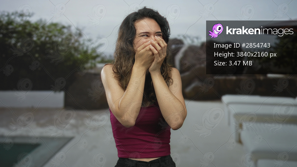 Woman covering mouth with hands at building poolside with tropical plants and deckchair lounge; joyful surprise.