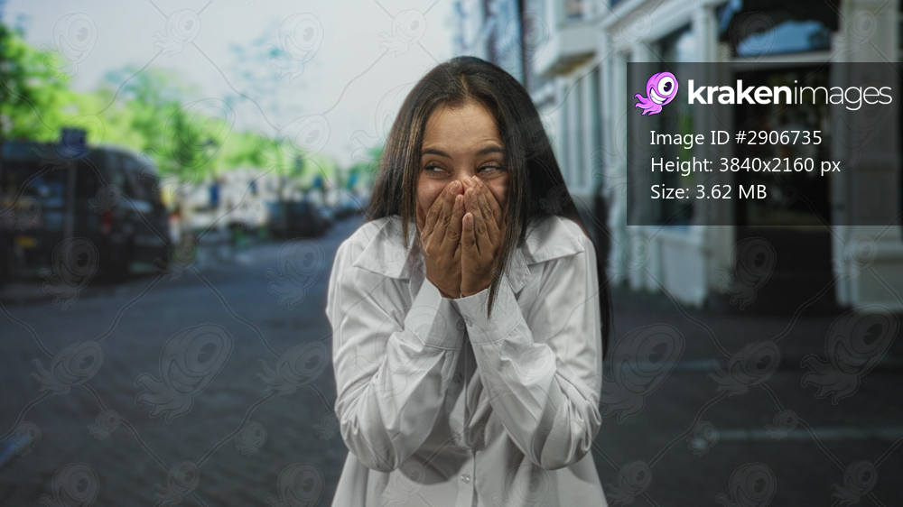 Woman covering mouth with hands, eyes closed, leaning forward in white shirt on a city street storefront with parked van and trees; joy playful.
