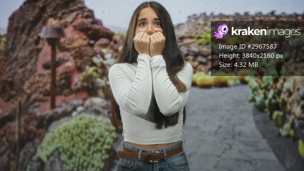 Woman covering mouth with hands in a studio backdrop, wearing white long sleeve crop top, jeans and belt, hands near lips; anxiety.