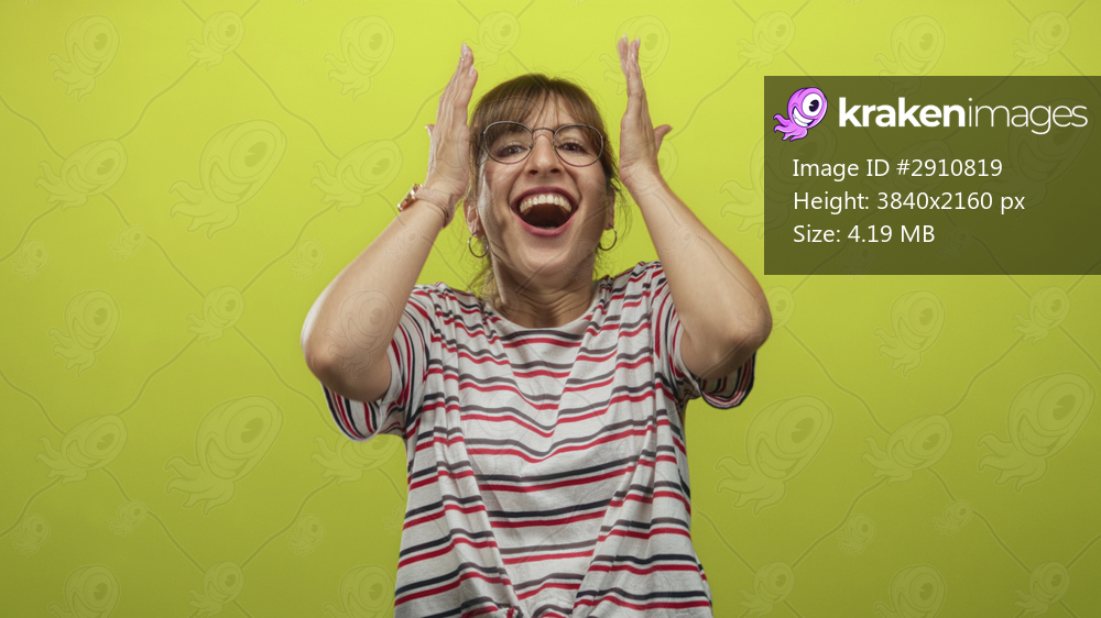 Woman covering mouth with hands in green studio wearing striped shirt and glasses; surprise reaction.