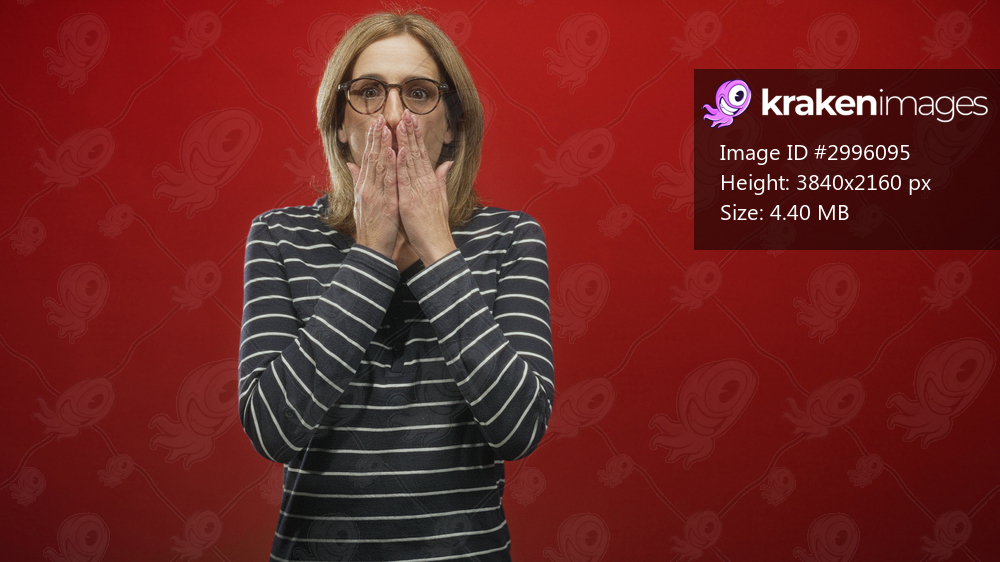 Woman covering mouth with hands in red studio wearing glasses and striped sweater; surprise reaction.